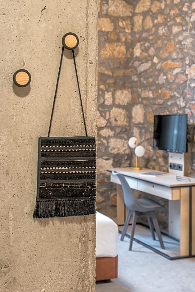 This studio features a large window and exposed stone walls. It includes a Smart TV and a fully equipped open-plan kitchen. The stone bathroom features a glass rainfall shower.