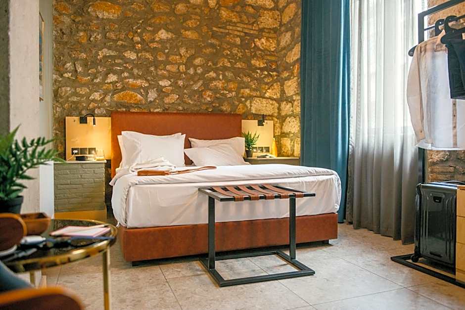 This studio features a large window and exposed stone walls. It includes a Smart TV and a fully equipped open-plan kitchen. The stone bathroom features a glass rainfall shower.